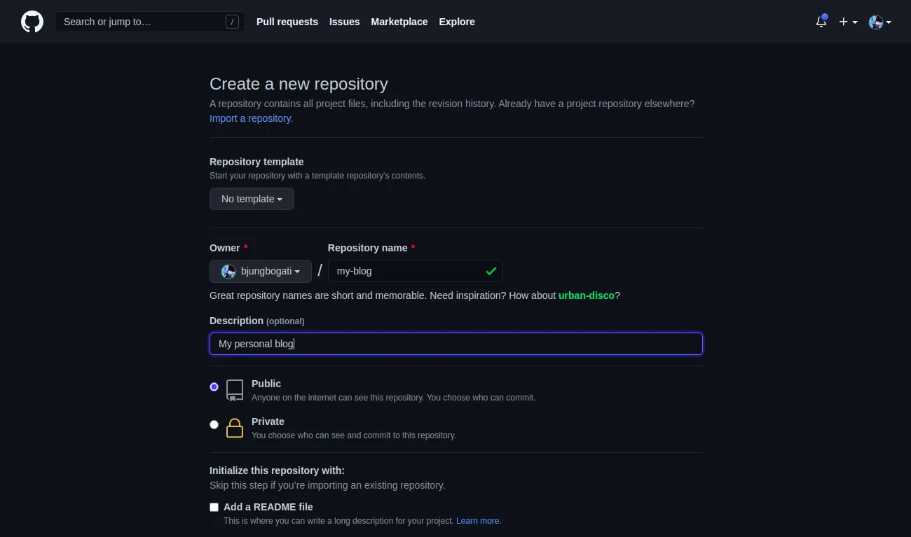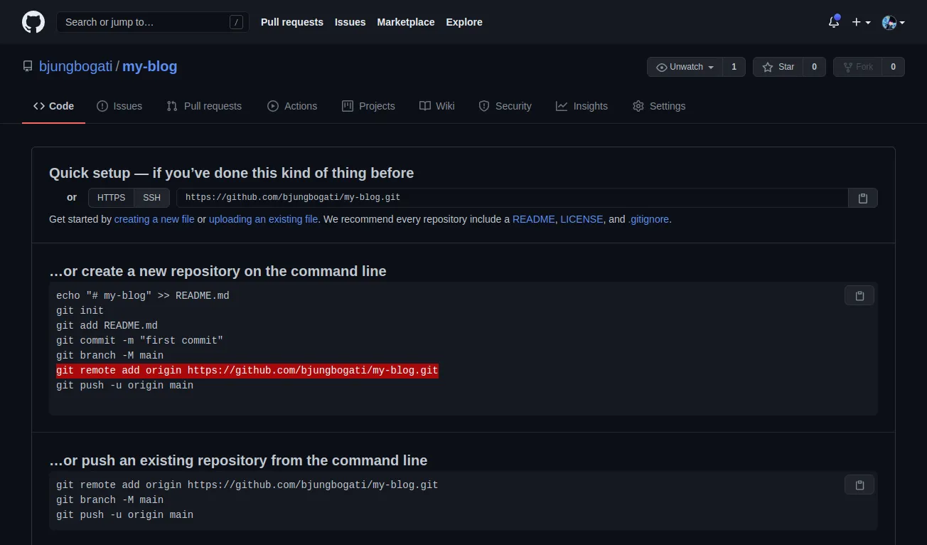 {} git add . git commit -m “added new blog” git remote add origin https://github.com/bjungbogati/my-blog.git git push -u origin master