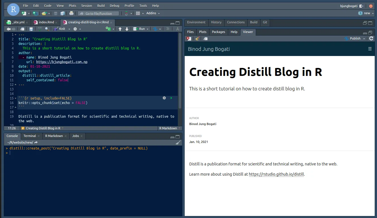 After that, distill will generate Rmarkdown file inside a folder. You can change your name and add content in your post.