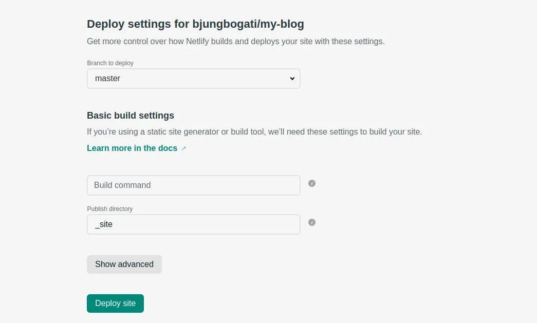- Now you can host your distill blog at Netlify. For that, you need to set branch to deploy master and publish directory _site.