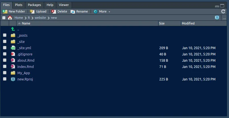 You can open index.Rmd file from Files (right-bottom). Then knit the index.Rmd file to generate a Home page (index.html).